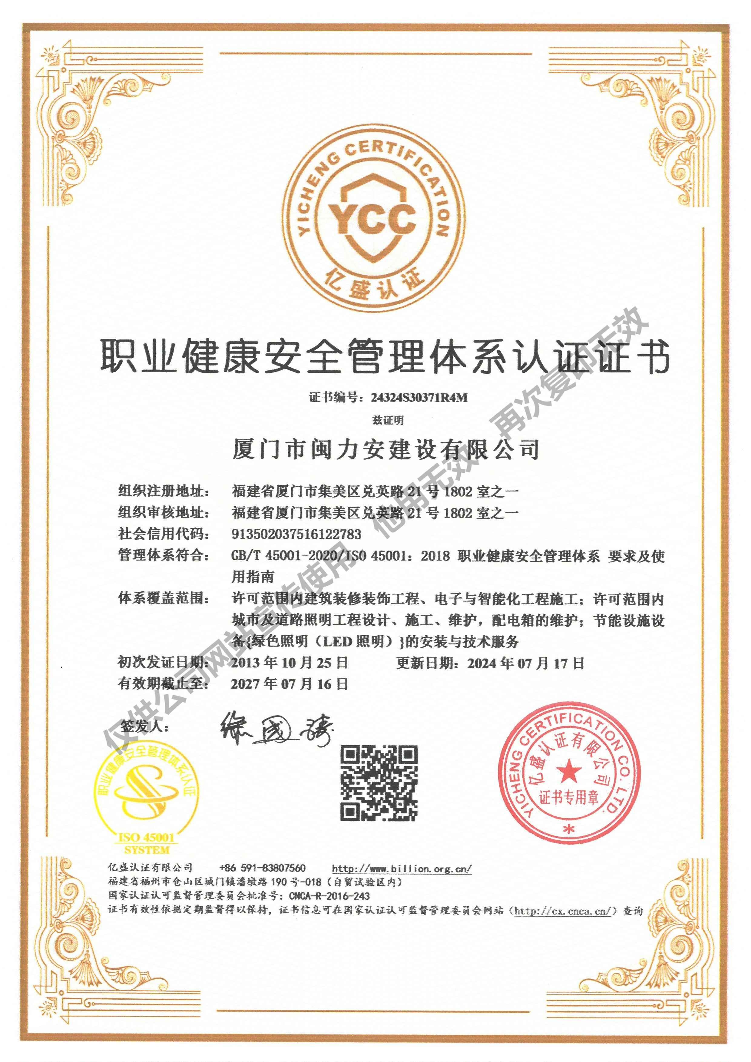 廈門市閩力安建設(shè)有限公司成立于2003年,公司取得市政公用工程施工總承包貳級、建筑裝修裝飾工程專業(yè)承包壹級、城市及道路照明工程專業(yè)承包壹級、電子與智能化工程專業(yè)承包貳級、消防設(shè)施工程專業(yè)承包貳級、電力工程施工總承包叁級、建筑機電安裝工程專業(yè)承包叁級、輸變電工程專業(yè)承包叁級、環(huán)保工程專業(yè)承包叁級、照明工程設(shè)計專項甲級、建筑裝飾工程設(shè)計乙級、施工勞務(wù)等資質(zhì)的綜合型企業(yè),公司于2013年通過了ISO9001質(zhì)量體系認證,ISO14001環(huán)境管理體系認證,OHSAS18001職業(yè)健康安全管理體系認證。